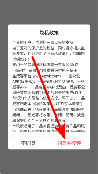 1、打开一品众包,在隐私政策弹窗中,点击同意并使用。