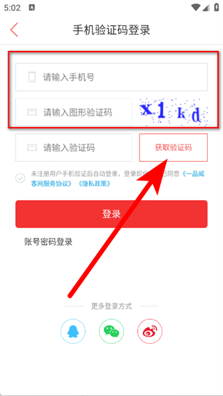 3、进入手机验证码登录页面,输入手机号、图形验证码,点击获取验证码。
