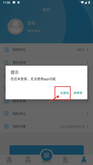 3、在提示弹窗中,点击去登陆选项,进入账号登录界面。