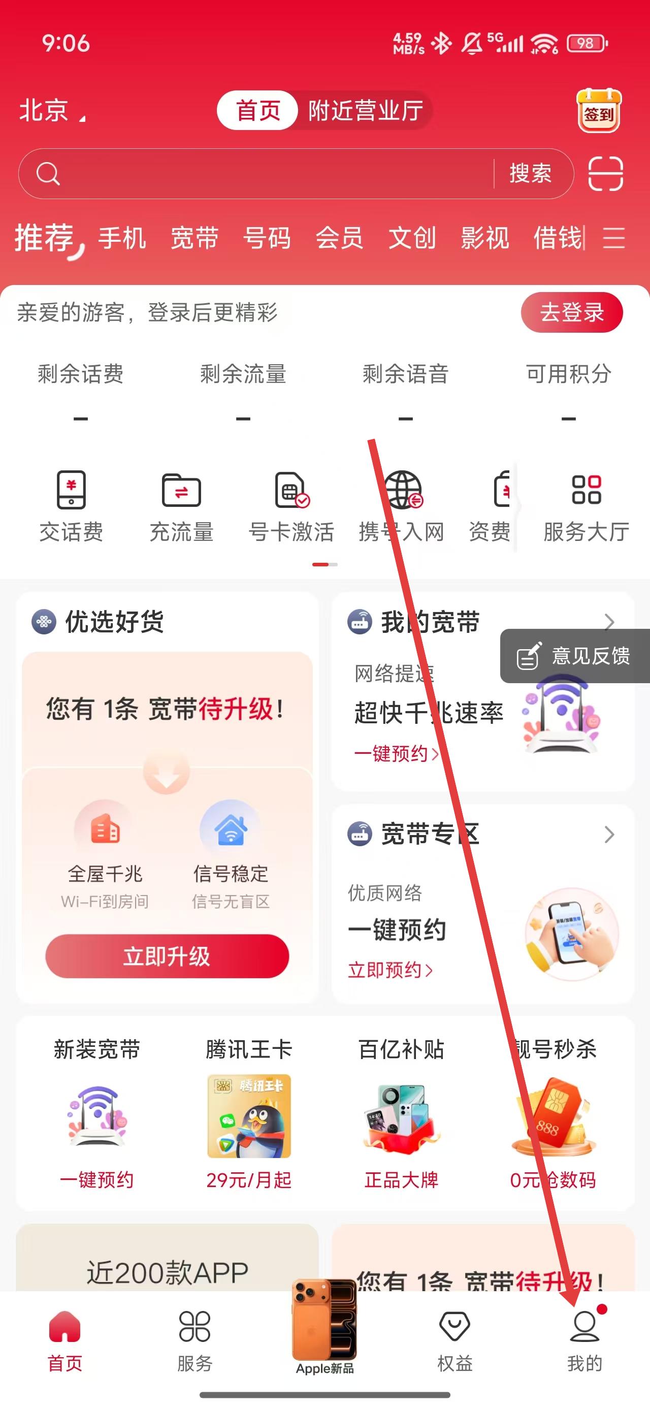 1、进入到中国联通首页中,可以点击下方我的按钮,进入我的主页。