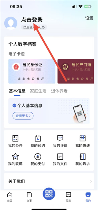 1、打开鄂汇办app,在我的页面点击登录区域,进入登录界面。