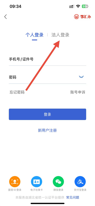 2、在登录界面点击法人登录选项,切换到法人登录页面。