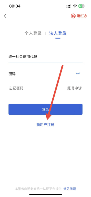 3、在法人登录页面点击新用户注册选项,进入法人用户注册页面。