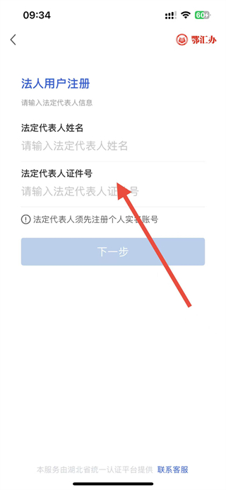 4、在法人用户注册页面输入法定代表人姓名、证件号等信息,按照提示完成后续操作即可完成法人身份注册。