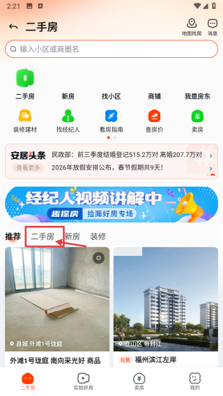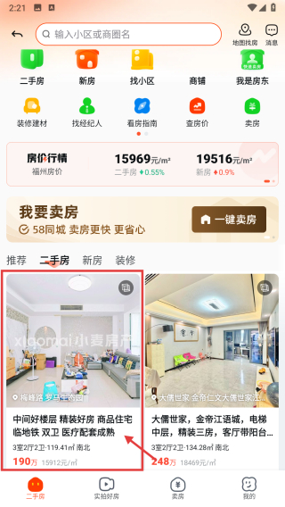 2、在二手房专区,点击二手房标签,筛选出二手房房源列表。