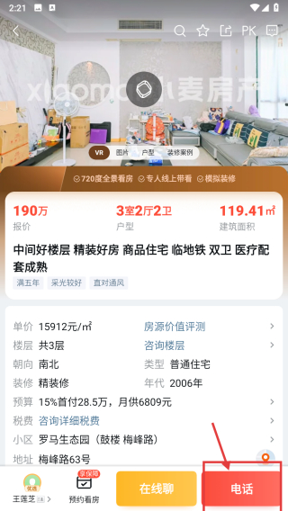 4、在房源详情页,可点击电话按钮,联系经纪人咨询房源信息。