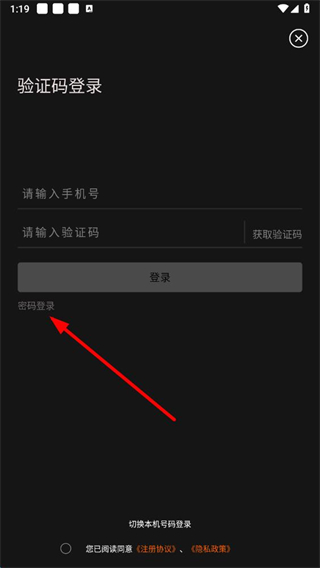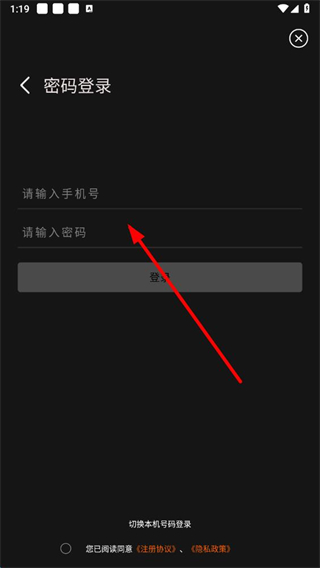 3、在密码登录页面,输入手机号和密码,勾选同意协议后,点击登录即可完成密码登录操作。