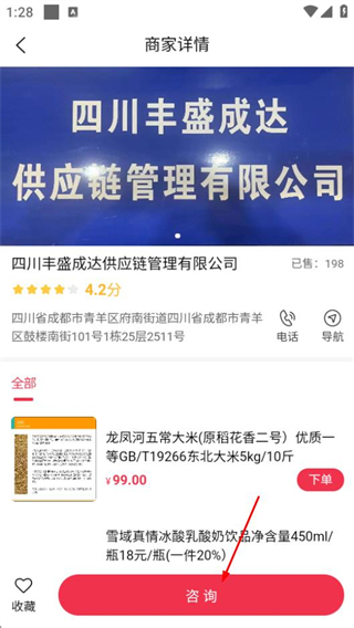 3、在商家详情页面,点击咨询按钮,可进行商家咨询完成订餐。