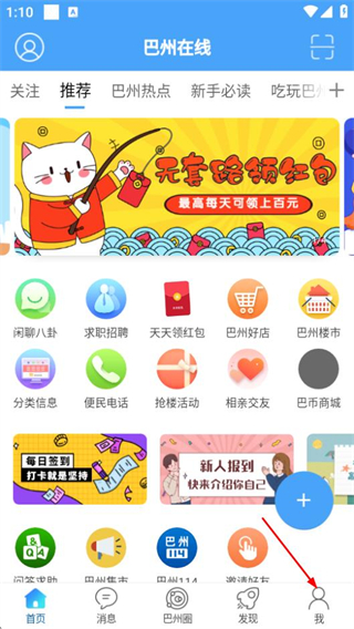 1、在巴州在线首页,点击右下角我选项,进入个人页面。