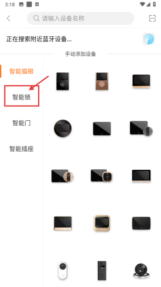 2、在设备添加界面,点击智能锁分类标签,筛选出智能锁设备列表。