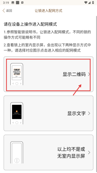 4、在配网方式选择页面,点击显示二维码选项,按照提示完成智能锁配网操作。
