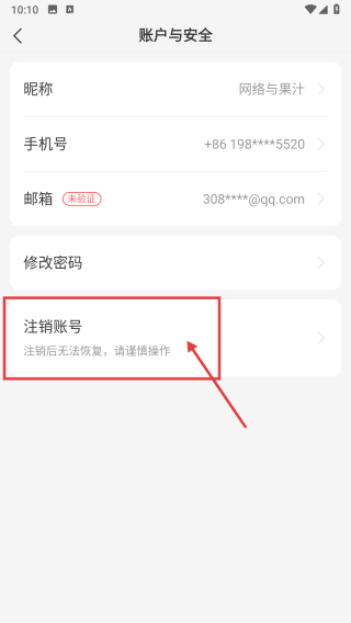 4、在账户与安全页面,点击注销账号选项,完成账号注销操作。