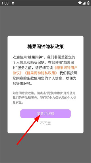 1、在糖果闹钟隐私政策弹窗中,点击同意,进入应用主界面。