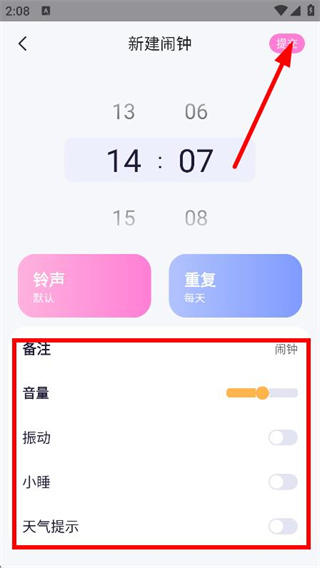 3、在设置时间、铃声、重复、备注等选项后,点击提交,完成闹钟创建。