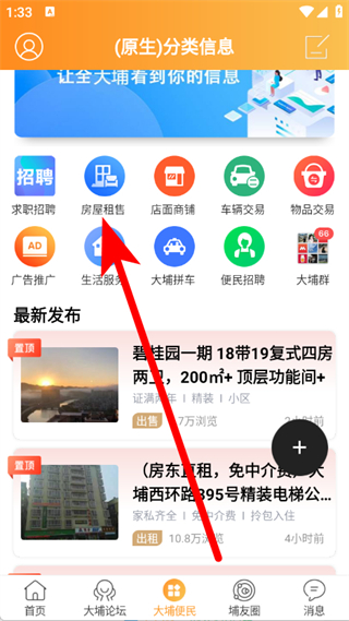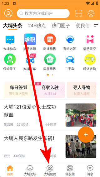 1、打开大埔网,点击底部导航栏大埔便民,进入分类信息页面。