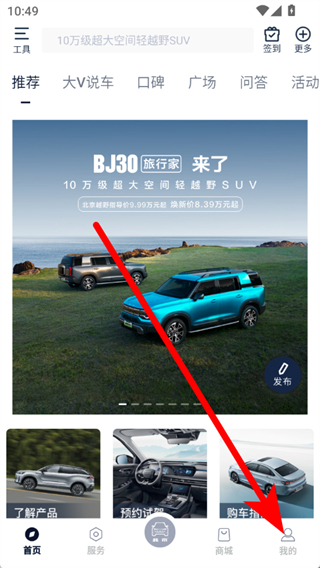 1、松开北京汽车,在首页点击底部我的,进入我的页面。