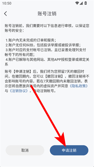 4、在账号注销页面,点击申请注销,完成注销。