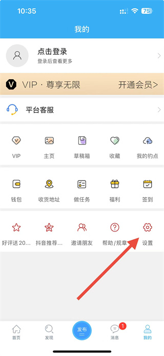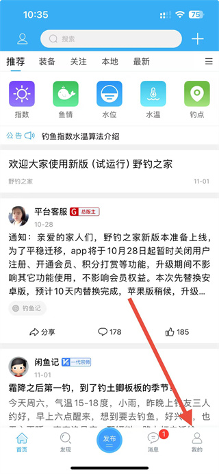1、打开野钓之家app,在底部右下角点击我的选项。