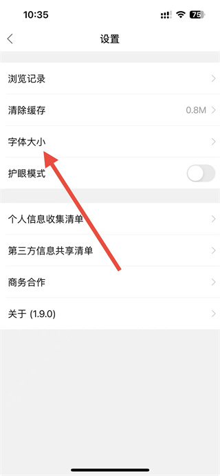 3、在设置页面中,点击字体大小选项,进入字体大小页面。