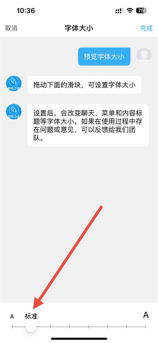 4、在页面底部,拖动底部滑块调整字体大小,调整后点击完成即可应用新字体大小设置。