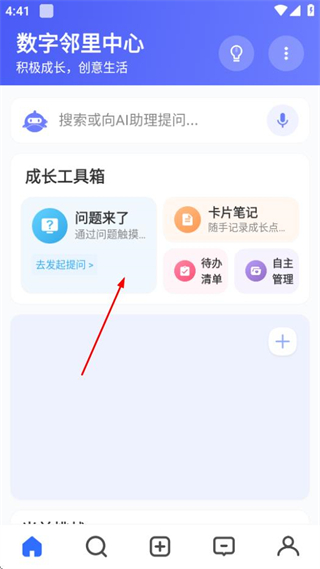 1、在数字邻里中心首页,点击问题来了选项,进入选择家庭名片页面。