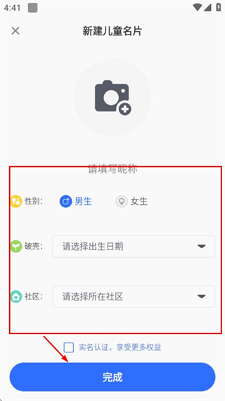 3、在新建儿童名片页面,填写信息后,点击完成按钮,即可完成儿童名片的新建。