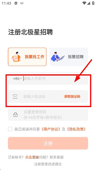 3、在注册页面,输入手机号后点击获取验证码,输入验证码。