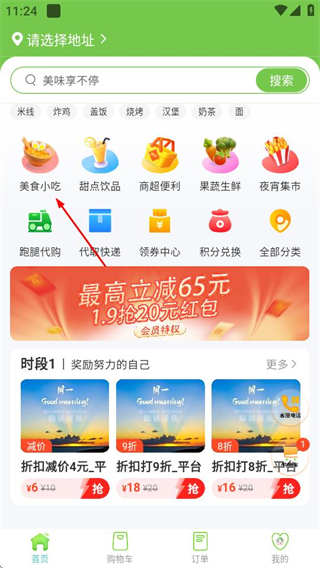 1、在嘀达外卖首页,点击美食小吃选项,进入外卖美食页面。