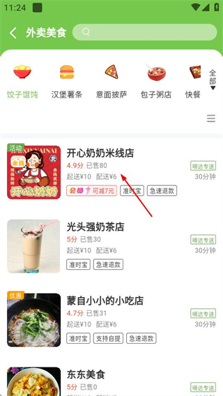 2、在外卖美食页面,选择要下单的店铺,进入店铺商品页面。