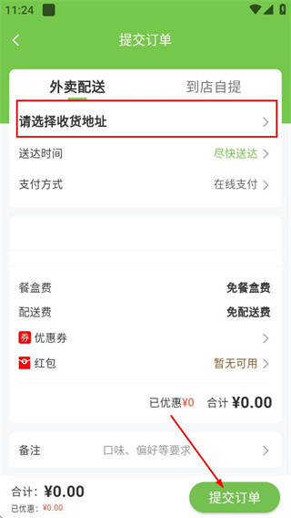 4、在提交订单页面,选择收货地址后点击提交订单按钮,完成下单操作。