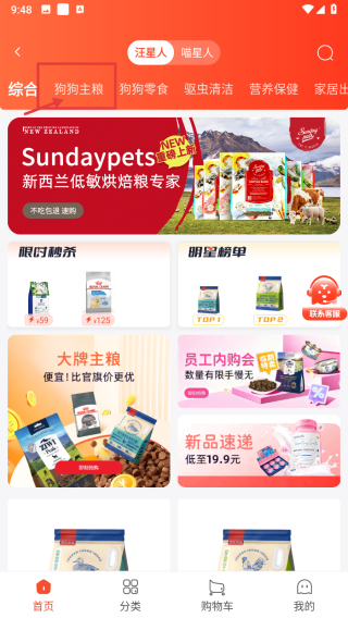 2、在商城页面,点击狗狗主粮分类标签,进入狗狗主粮商品列表页面。