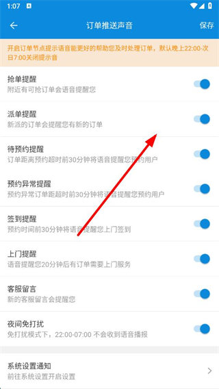 4、在订单推送声音页面,将抢单提醒、派单提醒等各项语音提醒的开关关闭,即可关闭语音播报。