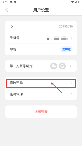3、在用户设置页面,点击修改密码选项,进入修改密码界面。