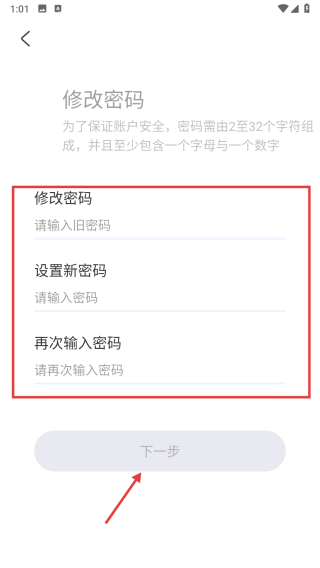 4、在修改密码界面,输入旧密码和新密码后点击下一步按钮,完成密码修改操作。