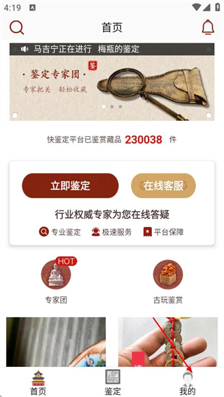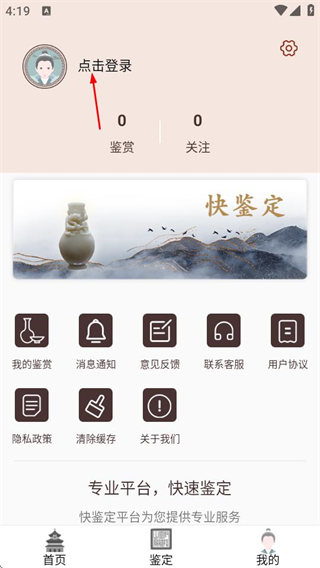 1、在快鉴定首页,点击右下角我的选项,进入个人页面。