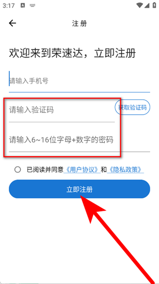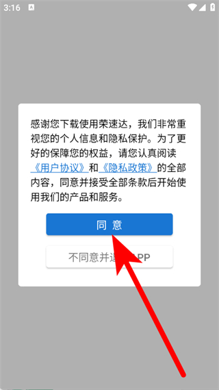 1、打开荣速达,在协议与隐私政策弹窗中,点击同意。