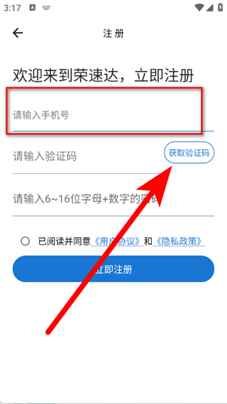 3、在注册登录页面,输入手机号,点击获取验证码。