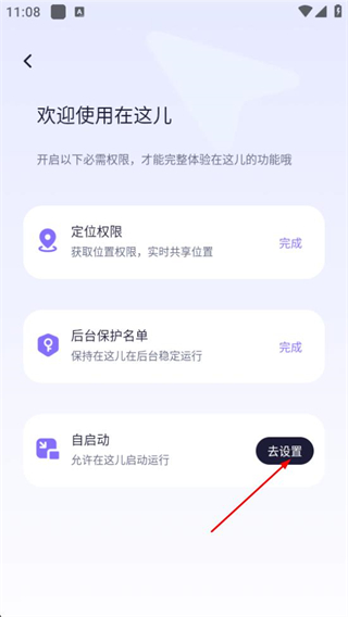 1、在定位界面点击去开启,点击自启动旁的去设置进入权限设置界面。