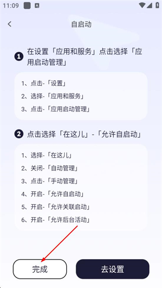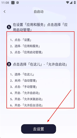 3、在自启动设置说明界面查看设置步骤后,点击去设置完成自启动设置。