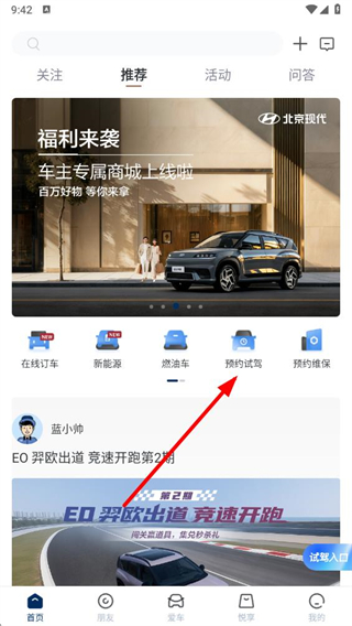 1、打开北京现代app,在首页点击预约试驾选项,进入预约试驾页面。
