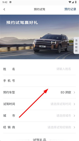 2、在预约试驾页面,依次输入姓名、手机号,选择预约车型、试驾时间、城市、经销商等信息。
