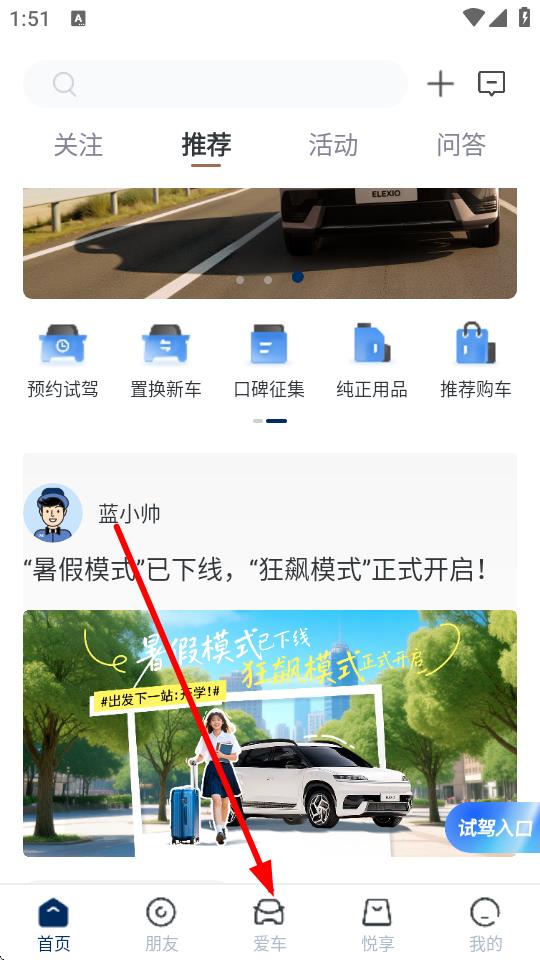 1、打开北京现代app,进入首页后点击底部导航栏中的爱车选项。