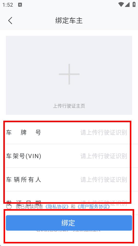 4、在新页面中,按要求上传行驶证主页照片,并准确填写车牌号、车架号车辆所有人等信息,勾选同意相关协议后,点击绑定按钮,完成车辆绑定操作。