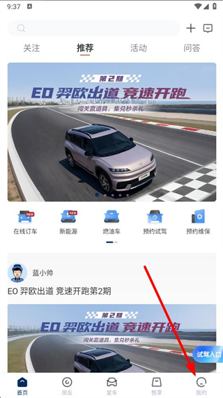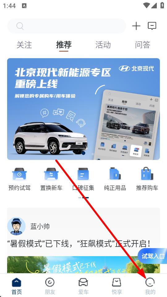 1、打开北京现代app进入首页,点击底部导航栏中我的选项进入个人页面。