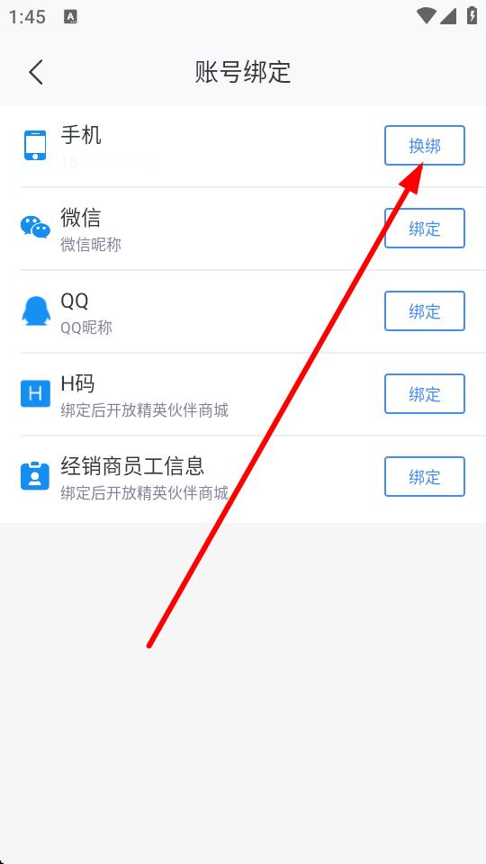 5、在账号绑定界面找到手机选项,点击右侧的换绑按钮,按提示完成手机号码修改。