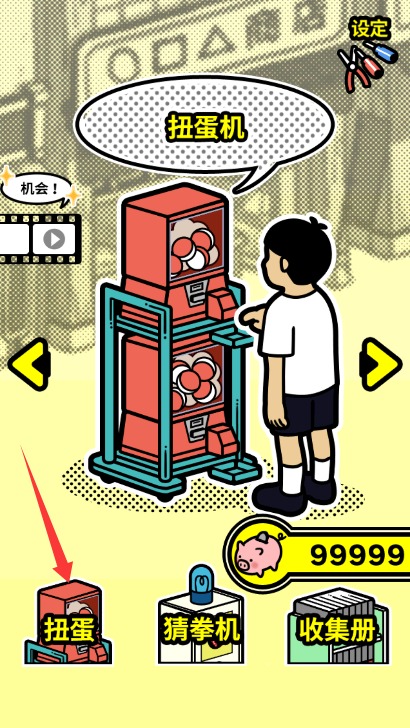 1、包括扭蛋机,猜拳机,收集册三种元素,扭蛋机作为主要的收集媒介,猜拳机可以获得金币;