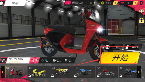 1、玩家进入游戏后可从车库挑选初始摩托车参与初级赛事,通过赢得比赛奖励金币用于购买性能更优越的机车或升级现有配件。