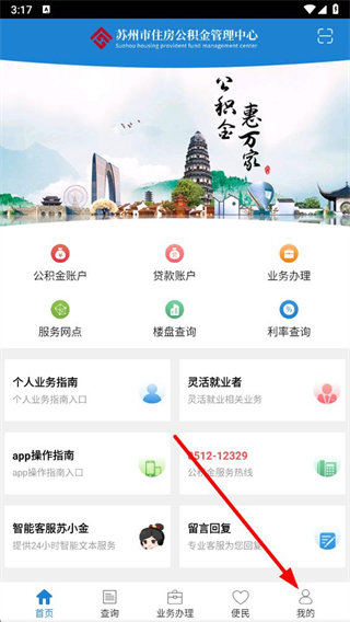 1、打开苏州公积金app,点击右下角我的选项,进入个人页面。