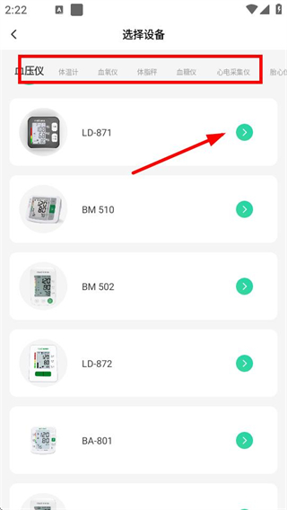 2、在选择设备页面,选择如血压仪类设备及具体型号。
