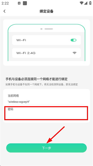 3、在绑定设备页面输入网络密码,点击下一步进行设备绑定。
